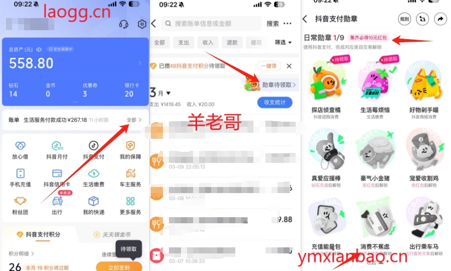 抖音-我的钱包-账单,如图勋章待领取,不显示10先随便拿一个勋章看看显示,必须有xyk才能完成所有,出行坐个公交或地铁就行了,感兴趣看看。