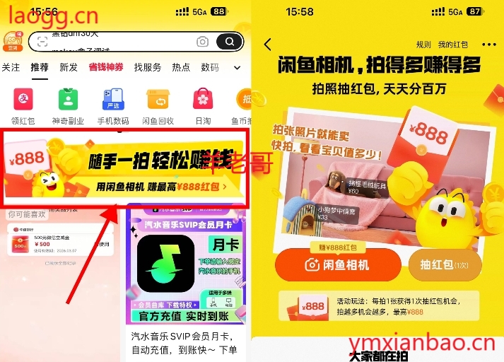 闲鱼app首页横幅,每天拍照得次数,抽0.88~888亓购物荭包,荭包可以搜“京东e卡”或者买自己想要的抵扣