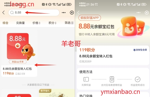 支付宝-我的-zfb会员,下拉到积分,搜索8.88,部分号可以兑换,9-8.88(少部分100-8.88),使用方法:蚂蚁财富app,基金-余额宝-转入9/100