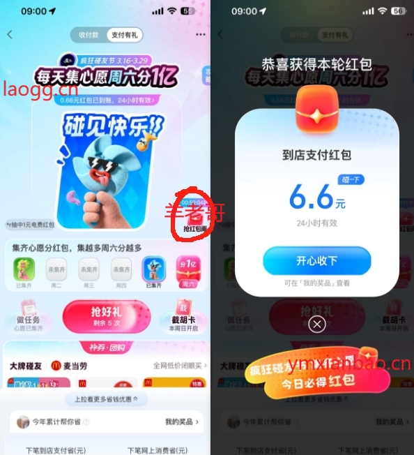 支付宝今天8-18点,每个整点有天降荭包雨,搜:支付有礼,或首页横幅碰友节进,提前进页面卡点点右侧荭包雨,抢的人多所以活动比较火爆(重试),未中是去晚了,今天可以多试试。部分号今天也弹3天的碰一下券