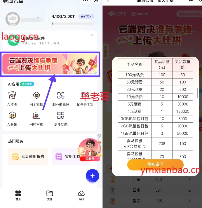 联通云盘抽1~100亓话费或会员