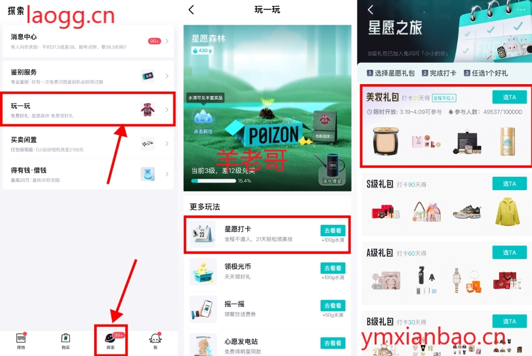 得物APP底部“探索”,点“玩一玩-心愿打卡”进入,连续打卡21天有美妆礼包