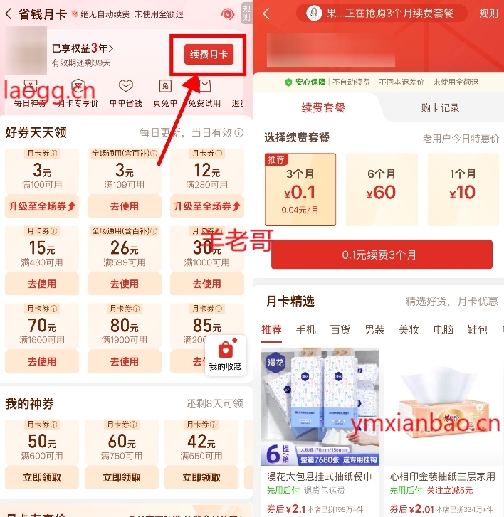 拼多多APP底部“我的”->省钱月卡->可反复开3~4次0.1亓3个月