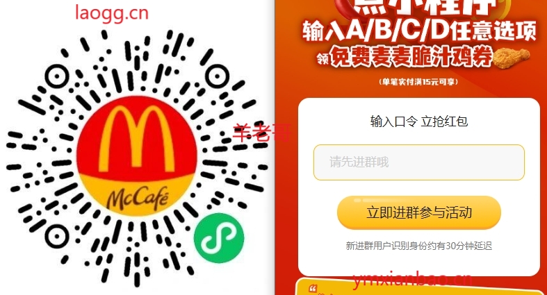 微xin识别,输入口令:A,有麦当劳麦麦脆汁鸡,需15随单,共40w份,4.1日截 有需可领,如A没有,就输入B C D就行