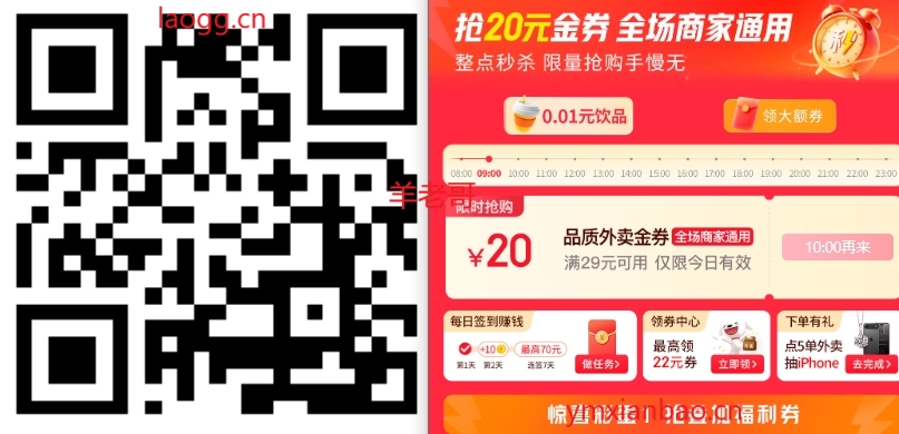 京东8-23点每整点抢29-20外卖券:https://u.jd.com/c1BL8yT,分享23-23大额卷:https://u.jd.com/c6VZnG7,8–12点&14-19点&每个整点17减16:https://u.jd.com/caUEMy7,塔斯汀/华莱士