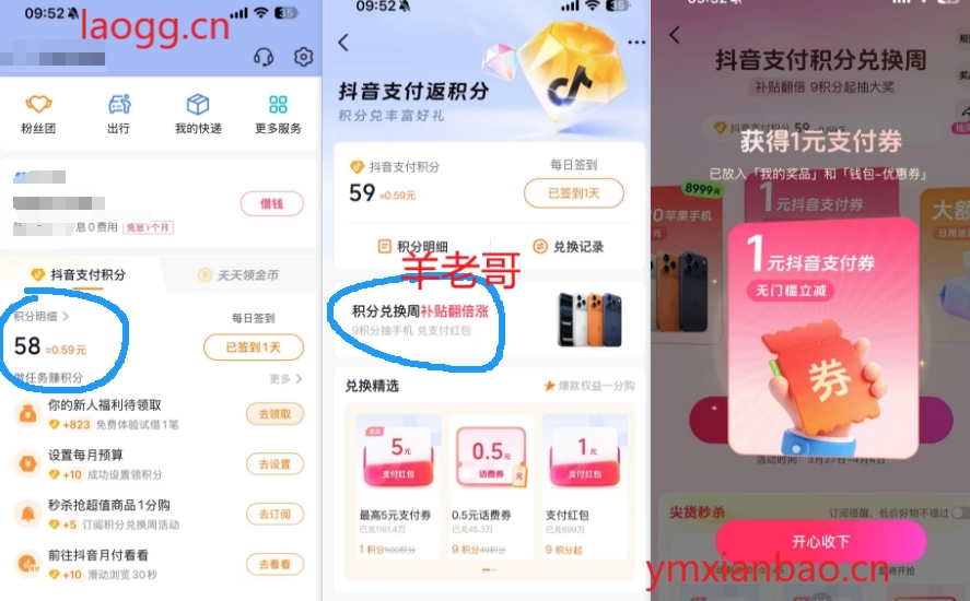 抖音积分兑换周2亓零钱或1亓支付券