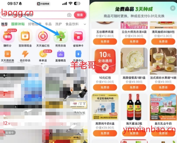 抖音商城APP 首页“兜兜农场”,先任选一件实物,每天做一下,大概3天就能拿到实物,注意:是抖音商城不是抖音,感兴趣需下载APP