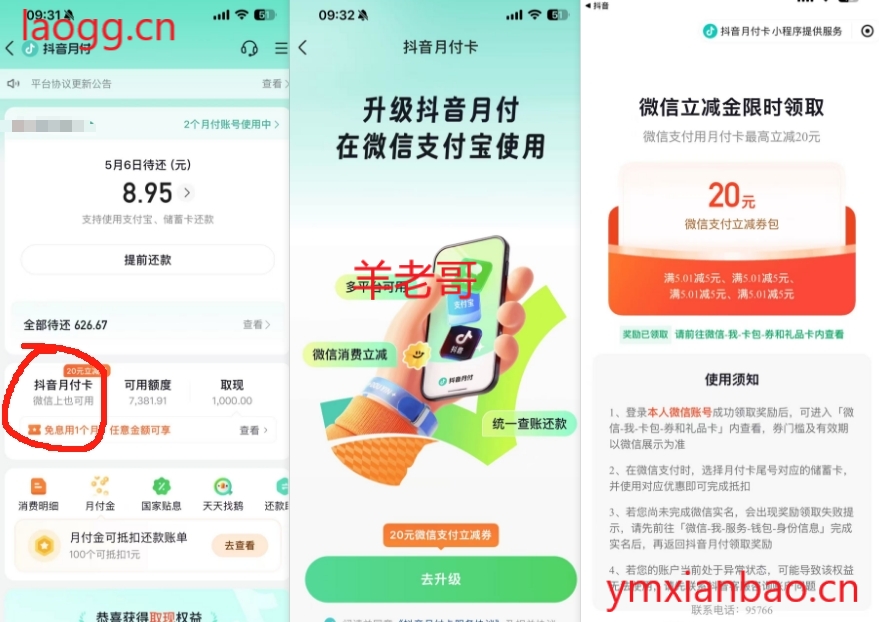 抖音-我的-我的钱包-抖音月付,如图月付卡右上角显示20微xin立减金(4张5,部分是1分买18券包),