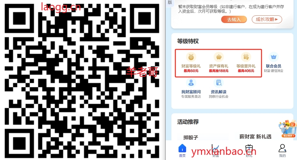 微xin识别,或建行生活app搜:财富会员,进”资产保有礼”,等级礼/保有礼/晋升礼上方三个点开都看看