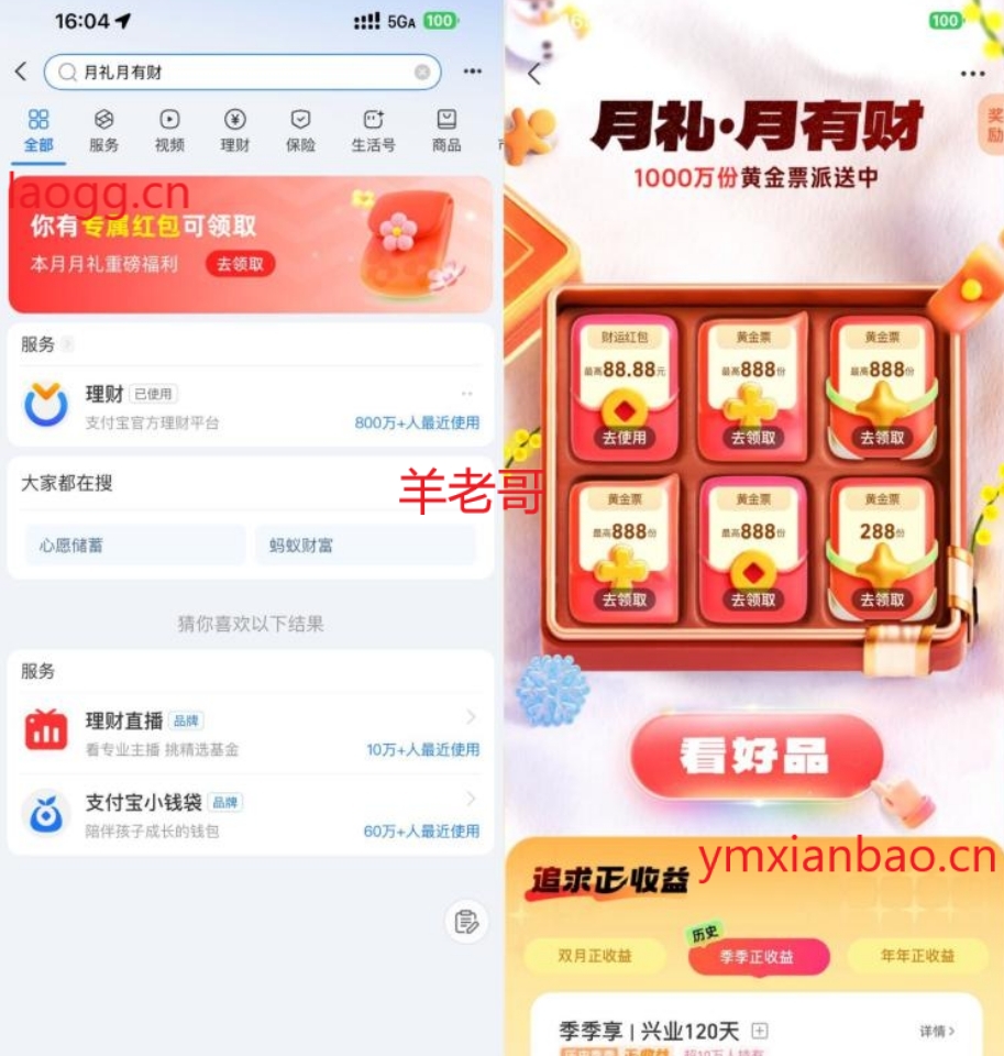 zfb搜索“月礼月有财”,一直点抽黄金票或荭包,需下载蚂蚁财富APP领