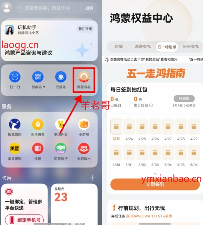 华为鸿蒙系统,负一屏“鸿蒙有礼”,五一特别版,每天签到领
