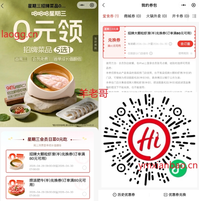 微xin识别,5选1领半份菜品券,限明天4月29日可用,刚好要吃海底捞的可以领下!mp://lPXR04ayCLUphoI
