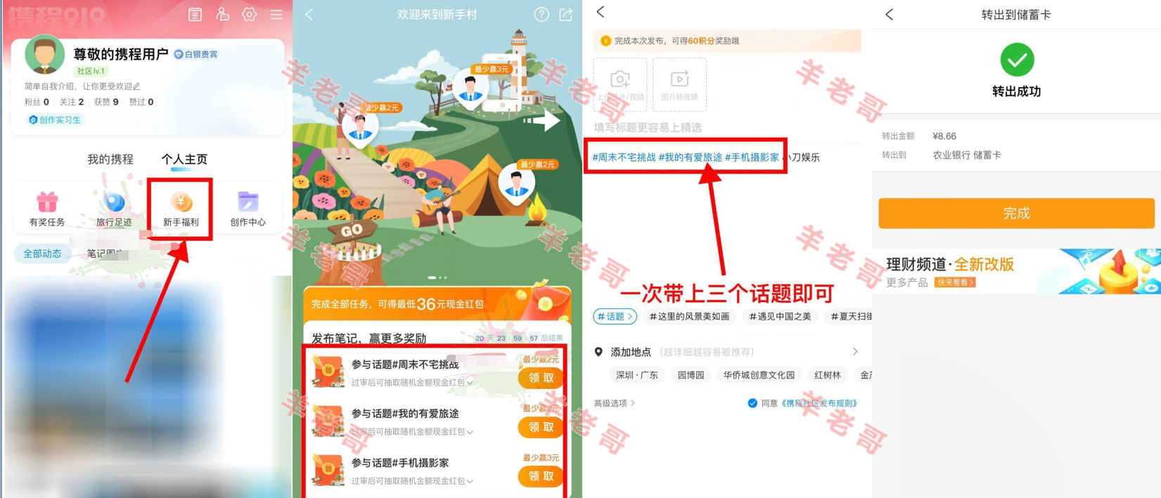 ->我的->个人主页->新手福利->带上话题发布笔记->等待审核通过且评级后领取红包(发布后过两天再去看看)->在“我的-我的携程-钱包”中提現