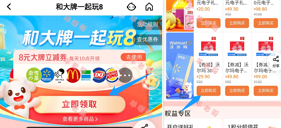 先领取8元大牌立减券,再去使用购买30元沃尔玛电子卡,支付会显示立减金,再去【闲宝卡】可以卖27.9元