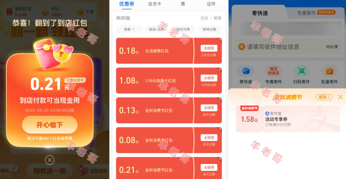 1、支付宝搜索“翻一翻”,根据页面提示翻牌抽到店红包 —— 2、支付宝搜索“韵达快递”和“中通快递”领取最高10元金秋消费券 ======== 提示:上面两个活动可以和早上的实体店通用红包叠加使用!没领的往上翻~